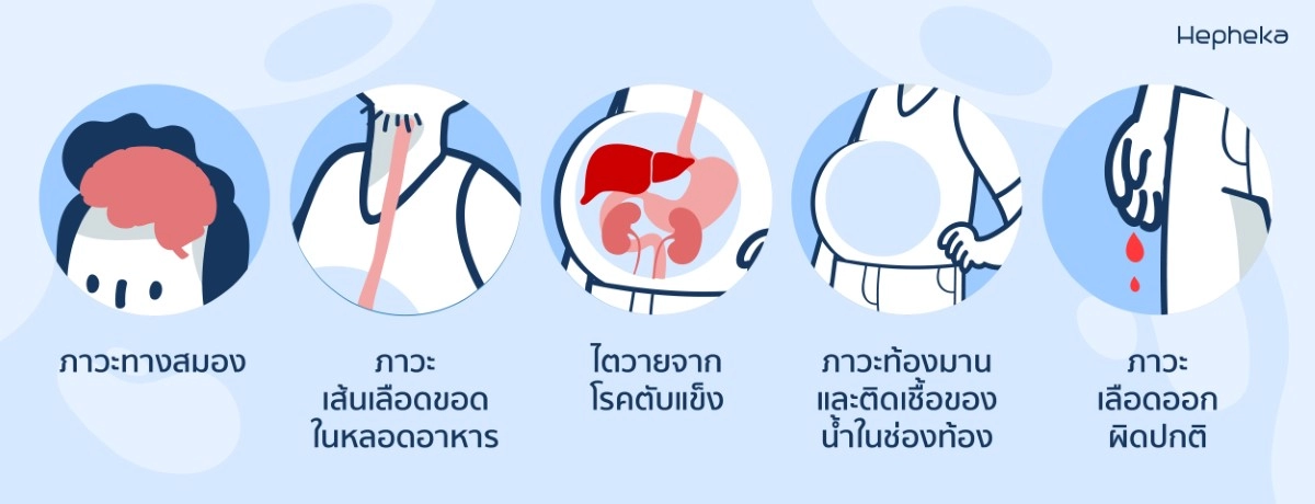 - ภาวะภูมิคุ้มกันอ่อนแอ ตับมีหน้าที่ช่วยสร้างโปรตีนและสารที่เกี่ยวข้องกับภูมิคุ้มกัน เมื่อทำงานลดลง ร่างกายจะติดเชื้อได้ง่ายขึ้น ทั้งในระบบทางเดินอาหาร ระบบหายใจ และอวัยวะอื่น ๆ